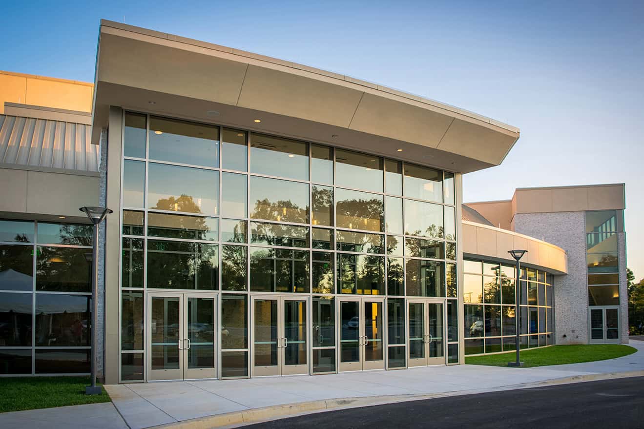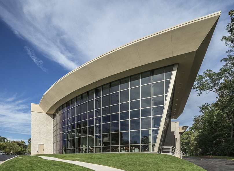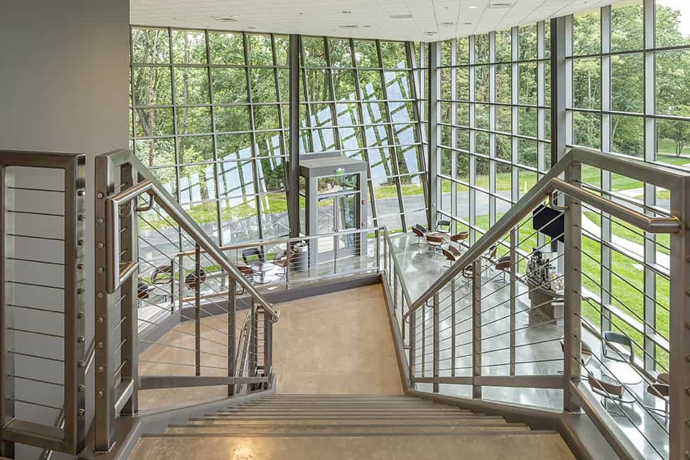 A soaring social space forms the heart of the building’s communal life. Defined by two-story glazing with arcing and angled glass planes, the space opens outward to views of the surrounding woods while drawing natural light deep into the interior. The geometry of the glazing and the vertical scale of the room establish a sense of movement and anticipation, creating a luminous gathering space that serves as both arrival and connection point.