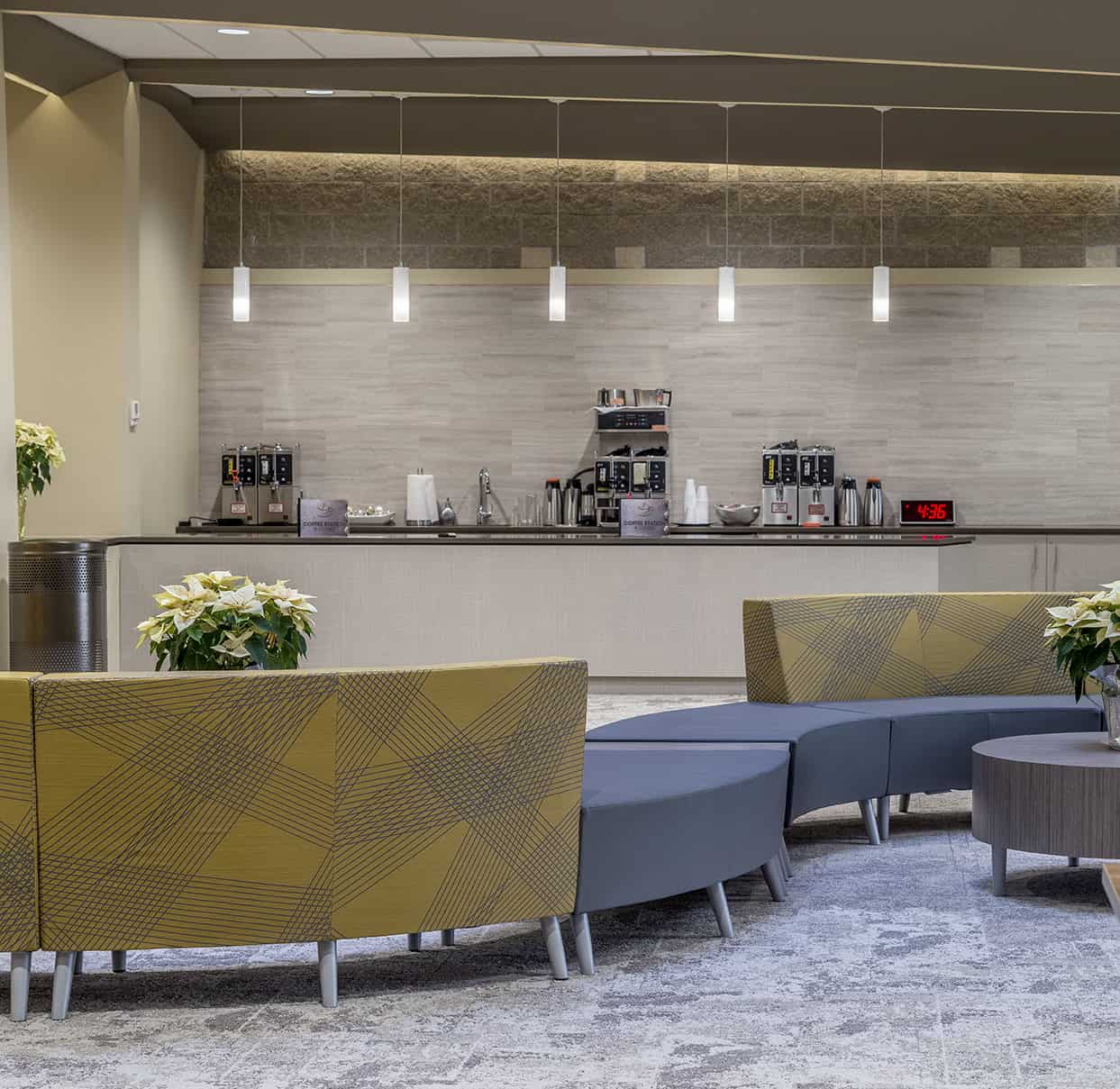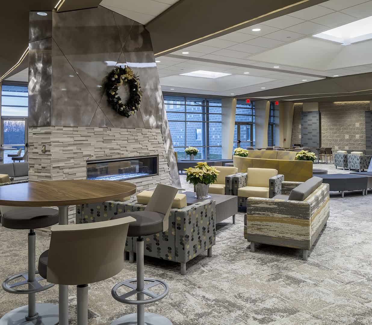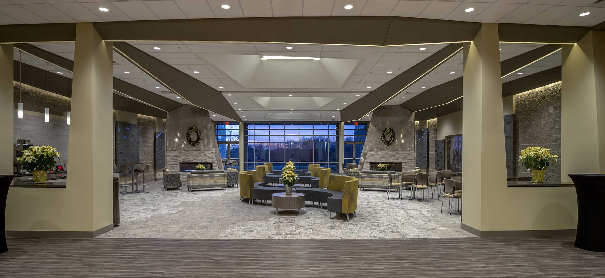 A dramatic, contemporary lobby serves as the primary connective space across the campus. Defined by expansive glazing, multi-story volumes, and strong visual transparency, the lobby functions as both gathering space and circulation spine. Natural light, open sightlines, and clear wayfinding allow the space to accommodate large crowds before and after services while maintaining a welcoming, energized atmosphere.